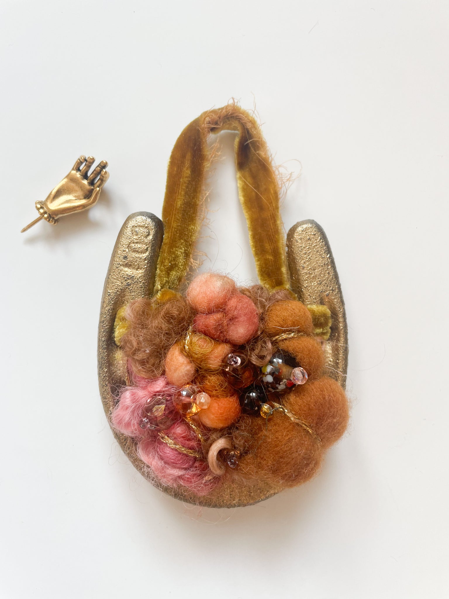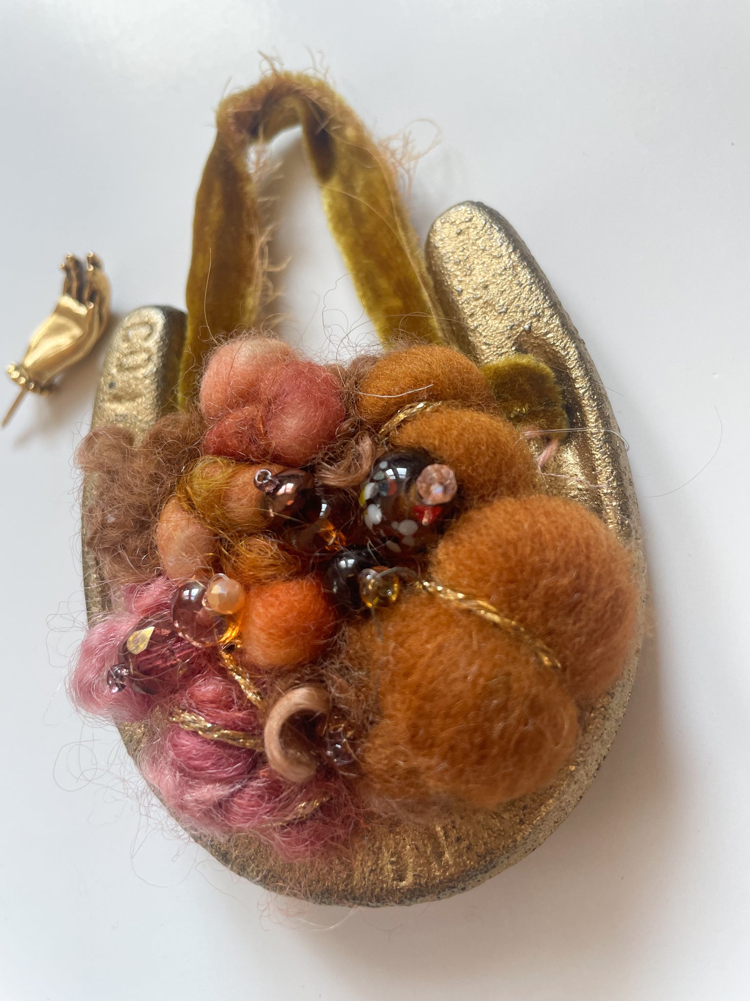 Lucky you! This sweet little woven ornament measures 3.5" tall and 3" wide. The golden horseshoe is strung on a velvet ribbon and is ready to go up on your tree. Included in the box is a decorative pushpin so you can continue to display your luck all year long.