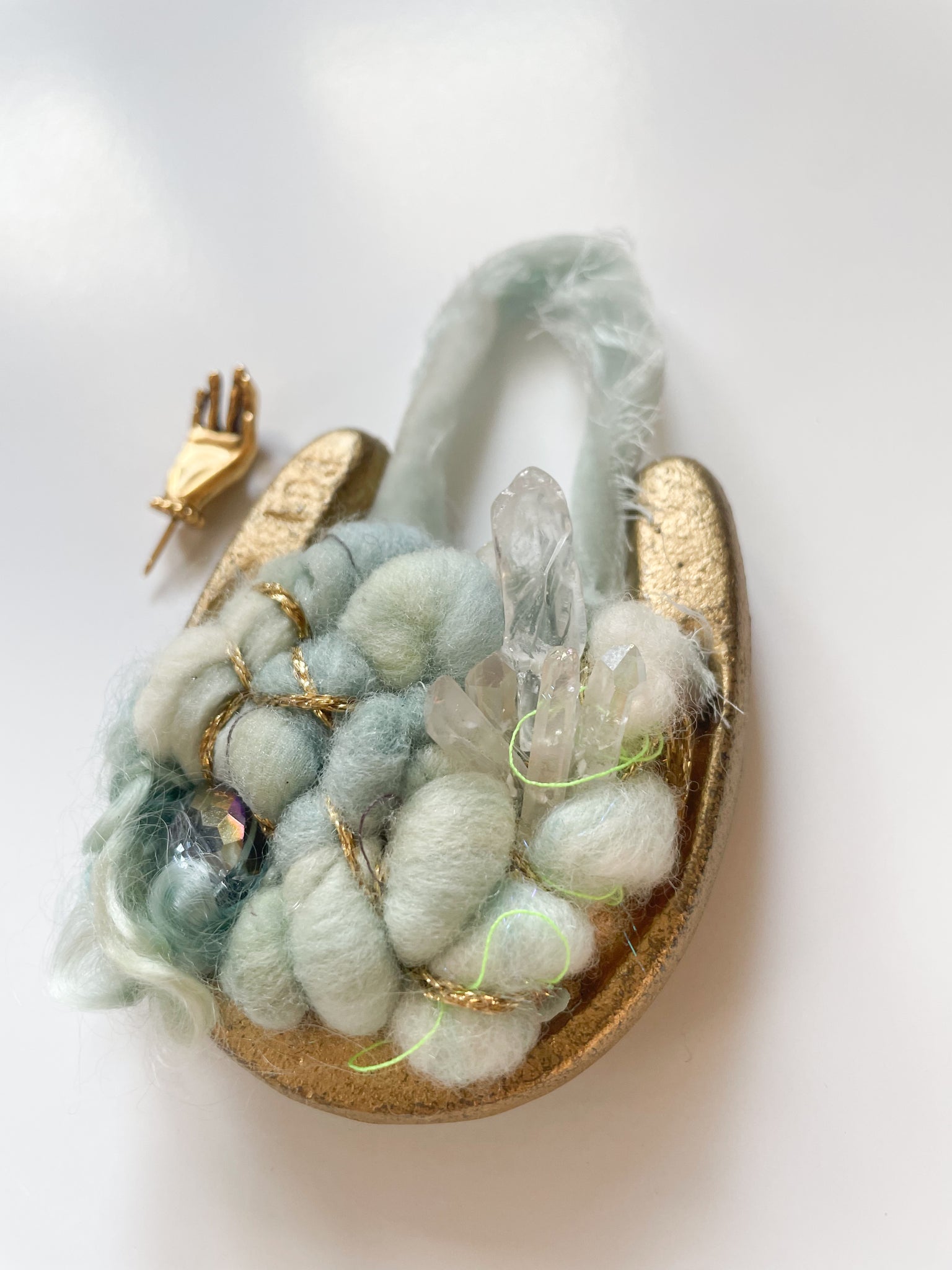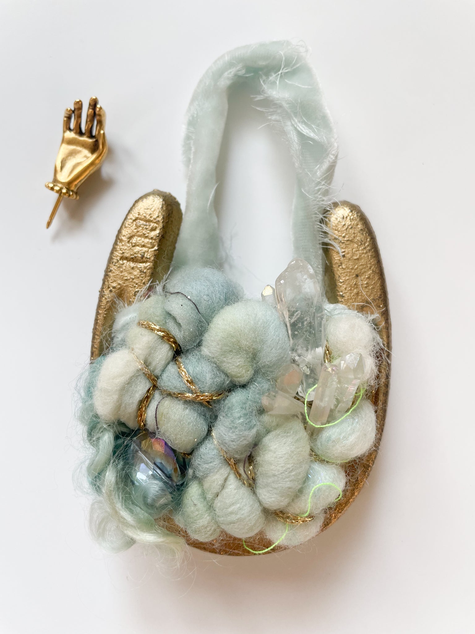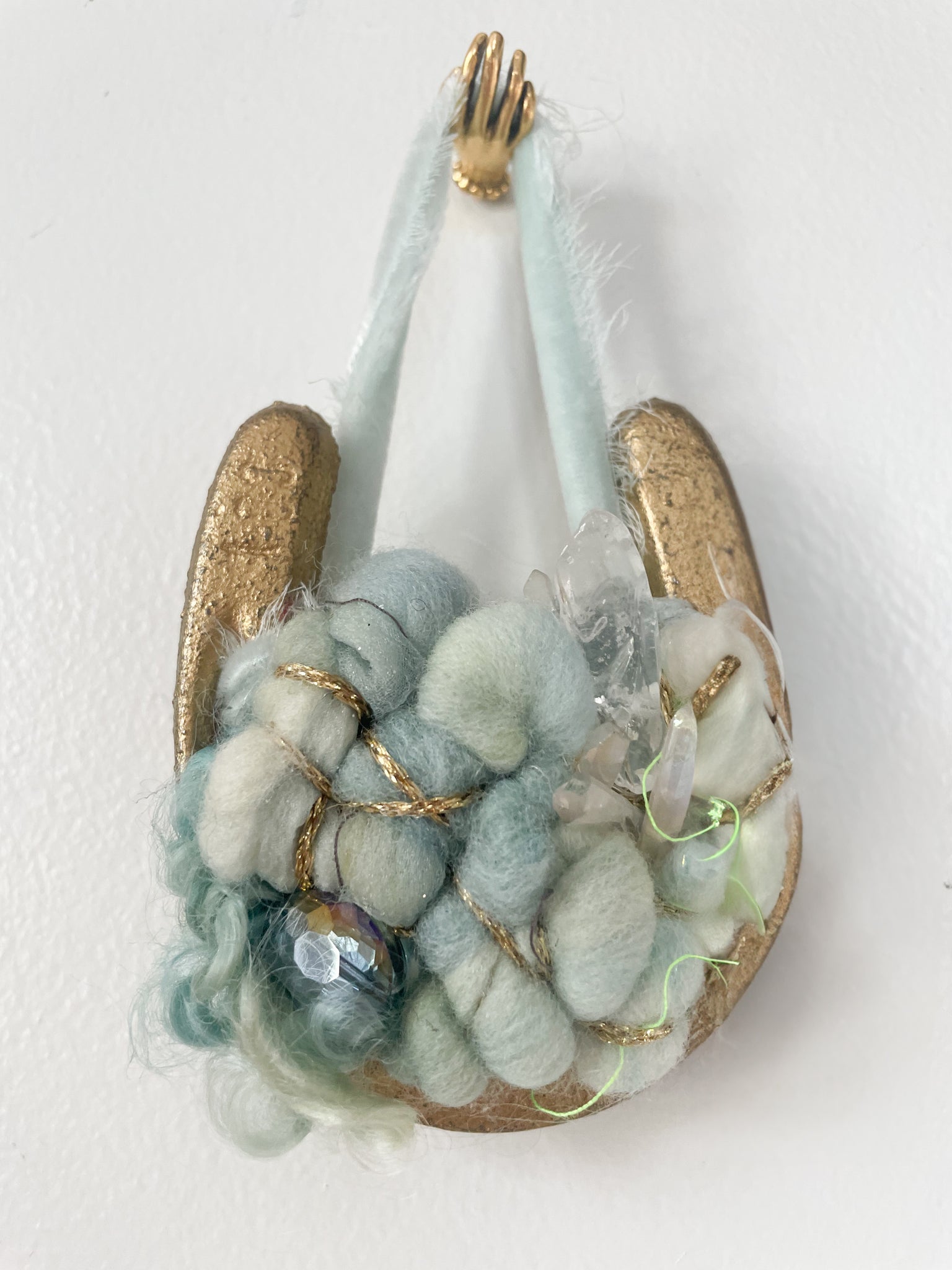Lucky you! This sweet little woven ornament measures 3.5" tall and 3" wide. The golden horseshoe is strung on a velvet ribbon and is ready to go up on your tree. Included in the box is a decorative pushpin so you can continue to display your luck all year long.